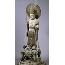 なかでも須弥壇四隅に安置されて本尊守護の役割をになう木造四天王立像(国宝)が、四体そろって寺外で公開されるのは初めてのことです。『日本書紀』にも記載のある作者、山口大口費(やまぐちのおおぐちのあたい)らによって造られたクスノキ材を用いた彫刻で、古代東アジア美術の様々な要素が凝縮した見事な彫像です。