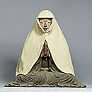 當麻寺本堂でまつられている中将姫の像。特別展の事前調査で像内に墨書銘[ぼくしょめい]が見出され、永禄元年(1558)の源三郎[げんざぶろう]作と判明した。源三郎は、室町時代に奈良の宿院[しゅくいん]に住した宿院仏師のひとり。仏道をこころざした中将姫の清廉なイメージを見事に具現化した、源三郎渾身の作である。