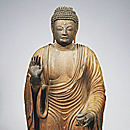 両手先と螺髪[らほつ]以外は、台座蓮肉までカヤの一材から彫出する一木造[いちぼくづくり]。遠くを見はるかすような表情、肩幅の広い体格や腹から太腿部分にかけて量感を強調する表現により、強い存在感を放つ。