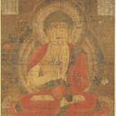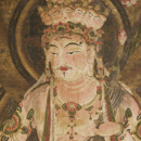 ほとけが坐る台座は、蓮弁の葉脈を截金[きりかね]線で表し、豊麗な暈繝[うんげん](グラデーション)で反花を彩るなど、豪華そのもの。一方、銀泥や銀截金を用いた竜胆[りんどう]唐草文で瀟洒[しょうしゃ]に荘厳される光背は、強い色彩を放つほとけの身体や台座を優しく包み込む。かつて奈良・法起寺周辺に伝来した、平安仏画を代表する名品。