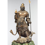 京都・教王護国寺(きょうおうごこくじ)(東寺(とうじ))像を原像とする兜跋毘沙門天像(とばつびしゃもんてんぞう)の模像。鎌倉時代の遺品はめずらしい。東寺像で練物(ねりもの)を用いる耳飾や瓔珞(ようらく)が、本像では銅製鍍金(ときん)で表される。面部の充実した肉取りや入念な作風は快慶の特色を示す。