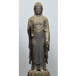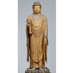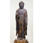 足枘(あしほぞ)に「巧匠(梵字アン)阿弥陀仏」の墨書があり、無位時代の快慶の作とわかる。明快な表情や衣文の表現、体軀(たいく)の肉取りなどに、若々しい感覚が充溢する。袈裟(けさ)を左肩から紐で吊り、末端を左腕に懸ける表現は、快慶の三尺(さんじゃく)如来立像では本像のみ。