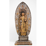 表面の美しい金泥塗(きんでいぬり)や截金文様(きりかねもんよう)をよく残す保存状態の良い作品。足枘(あしほぞ)に「巧匠/法眼快慶」(/は改行)の墨書があり、快慶の比較的晩年に近い時期の作と見られる。光背は当初のもので、周縁部に春日四所明神(かすがししょみょうじん)の種子(しゅじ)を表すことから、春日大社ないし興福寺周辺に伝来したと推測される。