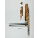 本品は宝庫に伝わる2張の箜篌のうちの一つ。現在大破し残欠となっているが、槽(そう)とその下に続く頸・脚柱部をキリの一木(いちぼく)から作り、頸部にカキ材の肘木(ひじき)を挿し込む構造である。共鳴胴となる内を刳(く)った槽には、黒漆塗(くろうるしぬり)が施され、革で作った鳥獣文を貼付け、花文や山岳文を彩色するという、華やかな装飾がなされていたとみられる。彩色に使用されていた顔料(がんりょう)から、本品は日本で製作された可能性が高い。