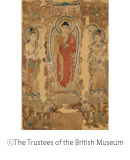 20世紀初頭に中国・敦煌(とんこう)の莫高窟(ばっこうくつ)で発見された繡仏(しゅうぶつ)。中央に赤い袈裟(けさ)をまとった如来立像(りゅうぞう)を表す。如来は右手をまっすぐに下し、左手で袈裟の端を握る。背後に岩が見える点も特徴である。如来の左右に脇侍(きょうじ)の菩薩と2人の僧侶が、それぞれ立像(りゅうぞう)で表される。下方に供養者たちと僧が表されている。刺繡の技法は鎖繡(くさりぬい)のみを用い、運針の方向で頰の丸みなど肉身の起伏を表現している。