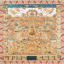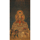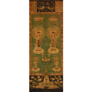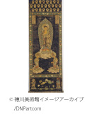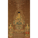 日本では刺繡(ししゅう)や綴織(つづれおり)など「糸」で表された仏の像が数多く作られました。とりわけ、古代では大寺院の一堂の本尊とされる花形的存在でした。綴織當麻曼荼羅(つづれおりたいままんだら)(国宝、奈良・當麻寺蔵)や刺繡釈迦如来説法図(ししゅうしゃかにょらいせっぽうず)(国宝、奈良国立博物館蔵)は、その隆盛のさまを伝える至宝です。また、糸を縫い、織る行為は故人の追善につながり、聖徳太子が往生した世界を刺繡で表した天寿国繡帳(てんじゅこくしゅうちょう)(国宝、奈良・中宮寺蔵)が生み出されました。鎌倉時代以降、刺繡の仏は再び隆盛を迎えますが、その背景には綴織當麻曼荼羅を織ったとされる中将姫に対する信仰がありました。極楽往生を願う人々は中将姫(ちゅうじょうひめ)に自身を重ね刺繡によって阿弥陀三尊来迎図(あみださんぞんらいごうず)や種子阿弥陀三尊図(しゅじあみださんぞんず)を作成しました。