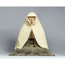 奈良時代に當麻寺(たいまでら)で出家して尼僧(にそう)となり、蓮糸で曼荼羅(まんだら)を織り上げて極楽往生を遂げたとされる中将姫の像。像内の墨書から永禄元年(1558)に宿院仏師(しゅくいんぶっし)の源三郎(げんざぶろう)が製作したと判明する。戦国騒乱期に中将姫信仰の高まりを背景に製作された記念碑的な像であり、仏道をこころざした中将姫の清廉(せいれん)なイメージを具現化した源三郎渾身(こんしん)の作。