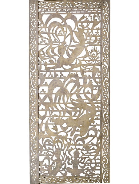 金銅板に仏菩薩(ぶつぼさつ)を透かし彫りした華麗な幡。本来織物製が多い幡の形状を忠実に再現し、高度な金工技術を示す。聖徳太子の娘・片岡女王(かたおかじょおう)による施入と考えられる。
