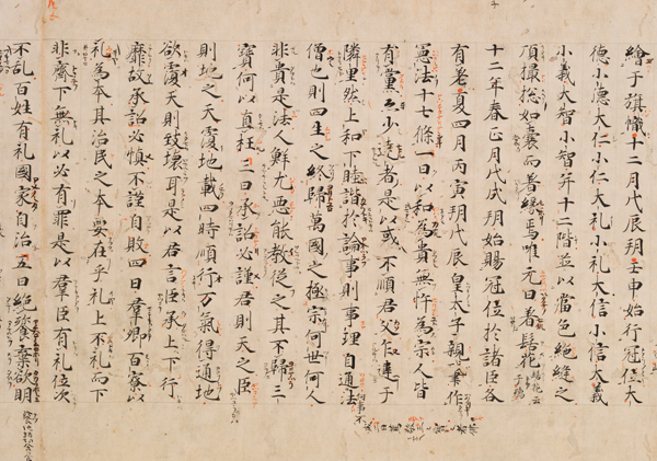 推古天皇12年(604)4月、聖徳太子によって憲法十七条が作られた。これはその記事を載せる『日本書紀』巻第二十二の現存最古の写本。