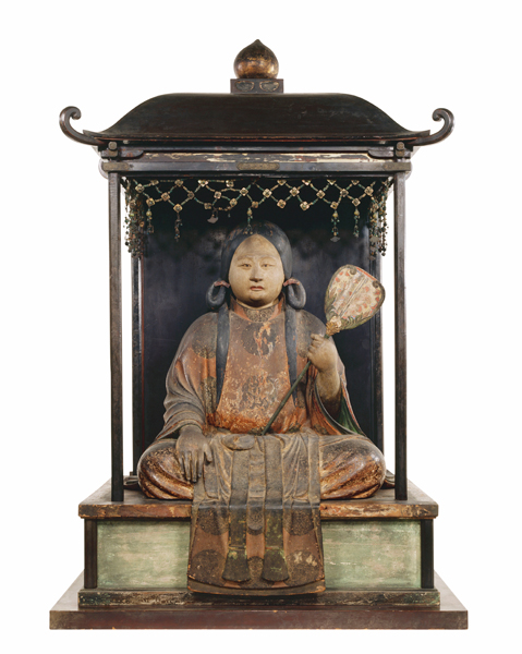 東院絵殿に安置されていた聖霊会の本尊。太子を穏やかな風貌の少年の姿で表す。像内銘により、仏師円快が制作し、秦致貞(はたのちてい)が彩色したことがわかる。