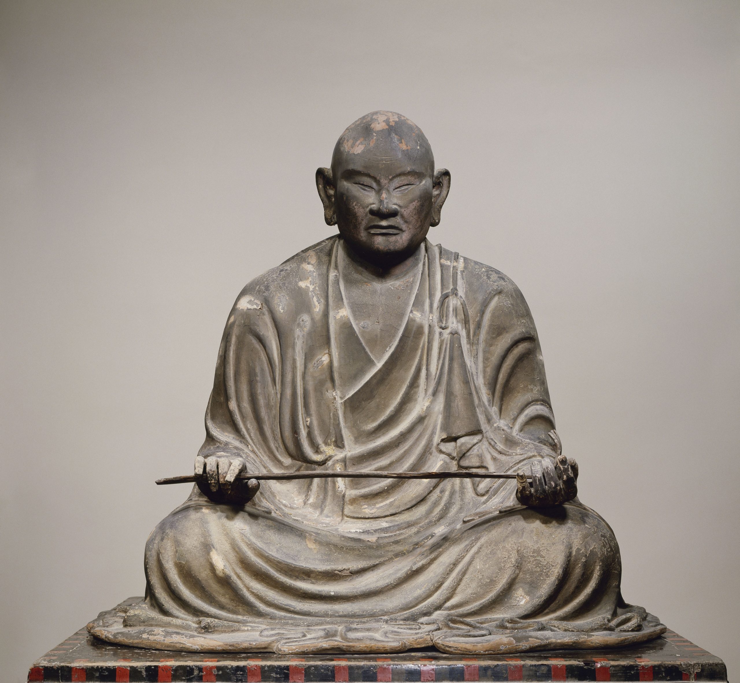 行信(ぎょうしん)(生没年不詳)は、荒廃していた斑鳩宮の地に、東院伽藍(とういんがらん)を建立したと伝える。威厳ある風貌を写実的に表した、奈良時代肖像彫刻の傑作の一つ。