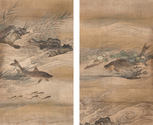 波濤(はとう)の間から水中を泳ぐ魚たちが見える。所々顔を出す岩石、水面に浮かぶ水草や水中に揺れる藻が、水墨と着色を巧みに併用しながら描かれる。室町時代の画壇の中心に居た狩野元信(かのうもとのぶ)の様式と見なされ、今回新たに確認された元信様式の藻鯉図として貴重。