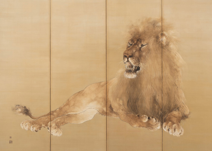 京都画壇の巨匠・竹内栖鳳(たけうちせいほう)の代表作。明治33~34年の渡欧後にライオンの絵が評判となった栖鳳が、明治37年に開催された米国・セントルイス万国博覧会に出品する刺繡壁掛の下絵として描いたものと指摘される。日本画の技法を用いて金地を背景に堂々としたライオンの姿を描く、藤田美術館の近代絵画を代表する傑作。