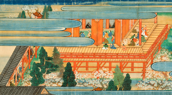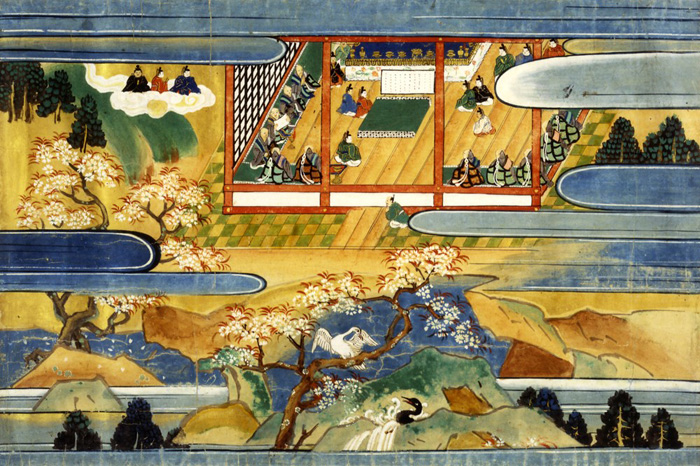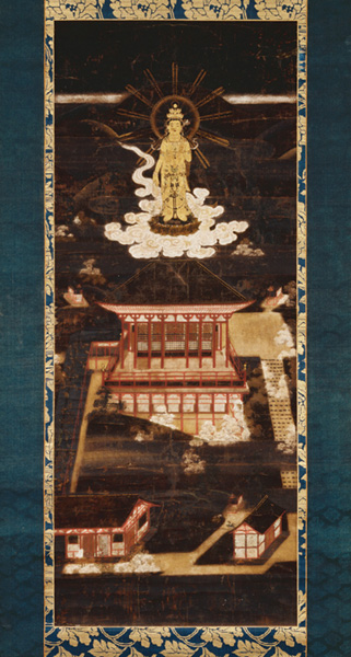 修二会(しゅにえ)の本尊である十一面観音が、雲に乗って二月堂の上空に現れています。右下の閼伽井屋(あかいや)付近には黒・白二羽の鵜が描かれ、鵜に続いて香水(こうずい)が湧き出たというお水取りの由来にかかわる説話を表しています。説話では、二月堂の本尊は閼伽器(あかき)の上に乗って海の彼方から現れたとされますが、この絵では雲に乗って現れる「来迎(らいごう)」の姿で表されるのが印象的です。