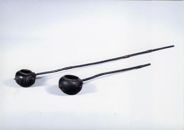 二月堂本尊(にがつどうほんぞん)に香水(こうずい)を供えた後、堂内の参詣者(さんけいしゃ)に香水を分ける際に柄杓(ひしゃく)として用いたもので、注口のついた形はお水取り独特のものです。壺(つぼ)の側面に線刻銘(せんこくめい)があり、製作年代と施入者(せにゅうしゃ)がわかります。