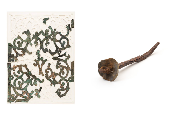 屋根の隅木先に取り付けられた大型で華やかな装飾金具と、釘頭を花形につくる長大な釘。飛鳥の地に営まれた前身寺院・大官大寺(だいかんだいじ)の格の高さを物語る。