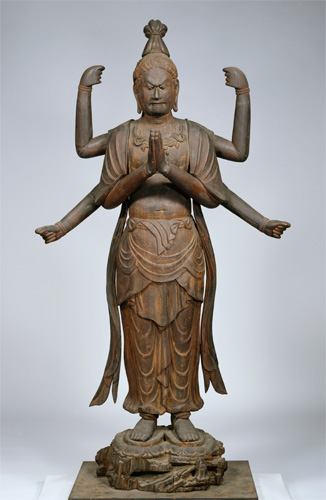 大安寺の嘶堂(いななきどう)に安置される秘仏。怒りの表情を示し、胸飾と足首に蛇が巻き付く表現から、当初から馬頭観音として造られた可能性が高い。体から伸びる6本の腕や髻(もとどり)は後補。