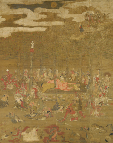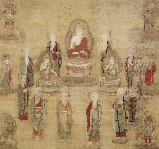 華麗な朱の衣を身にまとった釈迦如来を描く、平安仏画を代表する傑作。優美で理想的な姿には、平安時代に多くの釈迦像が規範にした大安寺釈迦如来像の面影が投影されているのだろう。