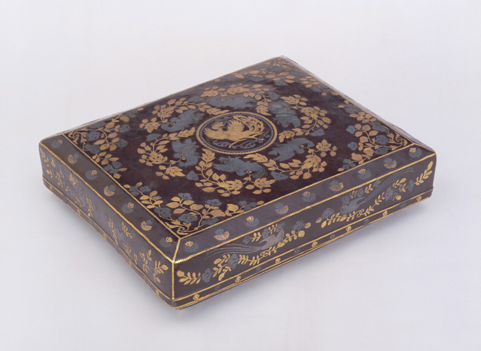 黒褐色地に金銀であらわされた文様が浮かび上がる豪奢(ごうしゃ)な箱である。蓋表(ふたおもて)は中央に鳳凰、周囲には鳥と花枝を組み合わせて旋回するように配置する。動物の皮をベースに何重にも漆を塗り込めて成形されている。漆を重ねる際、文様の形に切った金銀の薄板を貼り付けて、板に線状の彫り込みを加えて図柄を表し、その上から漆を塗り込めたあとに金銀の部分の漆を剝(は)いでみせる「平脱(へいだつ)」の技法を用いて作られている。