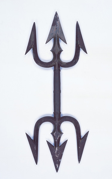 鉄製鍛造の仏具。把(つか)の両端に銛(もり)形をあらわし、三本の鈷を有することから、三鈷杵(さんこしょ)であるとわかる。中鈷・脇鈷ともに鋭い逆刺(さかし)をあらわし、さらに中鈷には把との間に節を付けるなど、古代インドの武器を源流とする金剛杵(こんごうしょ)の性格が強くあらわれている。このような形の三鈷杵は、空海による密教請来以前の古密教(雑密(ぞうみつ))の儀礼で用いられたと考えられる。本品には収納箱(素木三鈷箱(しらきさんこのはこ)・南倉53)が付属しており、本展には収納箱も合わせて出陳される。