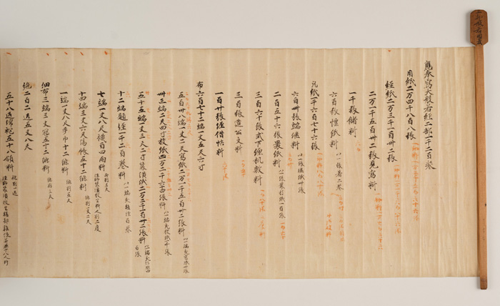 奈良時代の官営写経所(しゃきょうじょ)では、天平宝字6年(762)12月から翌7年4月にかけて、『大般若経(だいはんにゃきょう)』1部600巻を2セット、計1200巻を書写する事業が進められた。図版の文書は、事業の開始にあたり、同6年12月16日付けで作成された予算書である。紙や筆、墨といった写経に直接かかわる物品のほか、作業着用の絹等、写経従事者への給与や日々の食料、さらには刀子(とうす)や辛櫃(からびつ)などの雑具について、使用予定の数量が詳しく記されている。