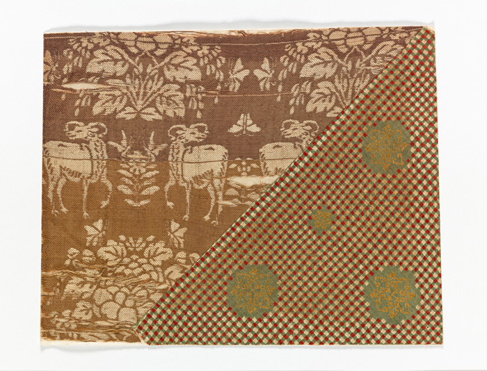 東大寺屛風(とうだいじびょうぶ)にかつて貼り交ぜられていた染織品(写真はそのうち14号(左)・15号(右))。天保4年(1833)の正倉院宝庫御開封に際して古裂の断片を貼り交ぜた屛風が作られ、後に東大寺屛風と呼ばれるようになった。これは正倉院の染織品に対する初の本格的な整理としても重要な意味を持っている。東大寺屛風はその後虫損が進んだため、昭和26年(1951)から3年をかけて解体され、屛風下地と染織品が別々に保存されることとなった。