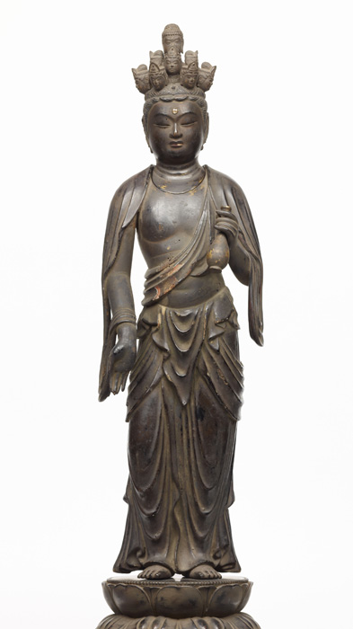 少年の相を表す可憐(かれん)な趣(おもむき)のある像。像内銘(ぞうないめい)や納入された経巻の奥書から、春日社四宮(よのみや)の本地仏(ほんじぶつ)として造立されたと考えられる。現状は古色を呈するが、当初は鮮やかに彩色されていた。