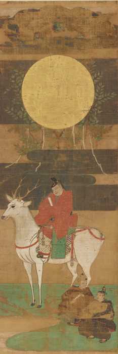 春日社一宮の武甕槌命(たけみかづちのみこと)が、神鹿(しんろく)に乗って常陸(ひたち)国(現在の茨城県)鹿島(かしま)より春日の地に来臨する様を描く。付き従う二人は春日大社の社司(しゃし)(神官)の祖と仰がれる中臣時風(なかとみのときふう)・秀行(ひでつら)。