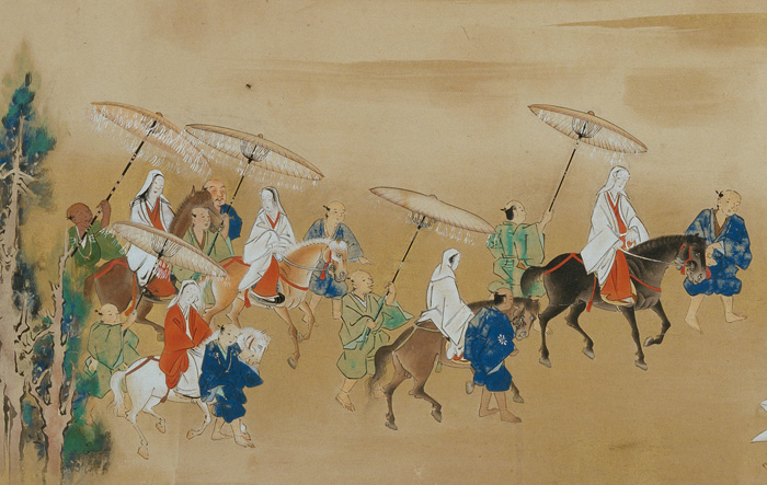 近世におけるおん祭の全貌を記録する貴重な絵巻。上巻は大宿所祭(おおしゅくしょさい)や宵宮詣(よいみやもうで)などおん祭前夜までの行事、中巻にはおん祭当日に行われるお渡り式、下巻は御旅所祭(おたびしょさい)から後宴能(ごえんののう)までの様子を順に描く。