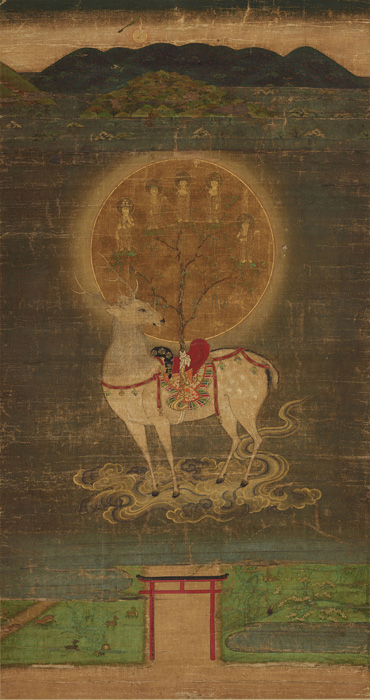 御蓋山(みかさやま)と春日山(かすがやま)を背景として、春日神の使いとされる神鹿(しんろく)が飛来する姿を繊細な筆致で描く。鞍(くら)上にある神木の枝先には、春日社祭神の本来の姿とされる五尊の仏菩薩が表される。