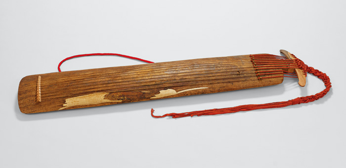 新羅琴は、中国の筝を模して朝鮮半島で発達した十二絃の楽器で、わが国では新羅から渡来した音楽である新羅楽)に用いられた。本品は、『国家珍宝帳』に記載される「金鏤新羅琴」2張が弘仁14年(823)に正倉院から出蔵された折に、それらに替えて納められた新羅琴2張のうちの1張にあたる。羊耳型の特徴的な緒留めが付き、槽(胴部)の表面には金箔を細く切った截金で、輪形の草花文の中に配される鳳凰などを精緻に表している。