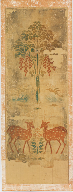 『国家珍宝帳』に記載される17組の「驎鹿草木夾纈屛風」の一部にあたるもの。夾纈とは、図柄を彫り出した板で裂を挟んで防染し、複数の色を使って染める技法のこと。本品は二つ折りの裂を挟み左右対称の文様を染め出している。大きな樹木のもとで草花をはさんで向かい合う2頭の鹿を表し、周りには鳥や草花を配する。樹の下に対の動物を表す文様は西アジアに起源があり、国際色豊かな正倉院宝物の一面がうかがえる。