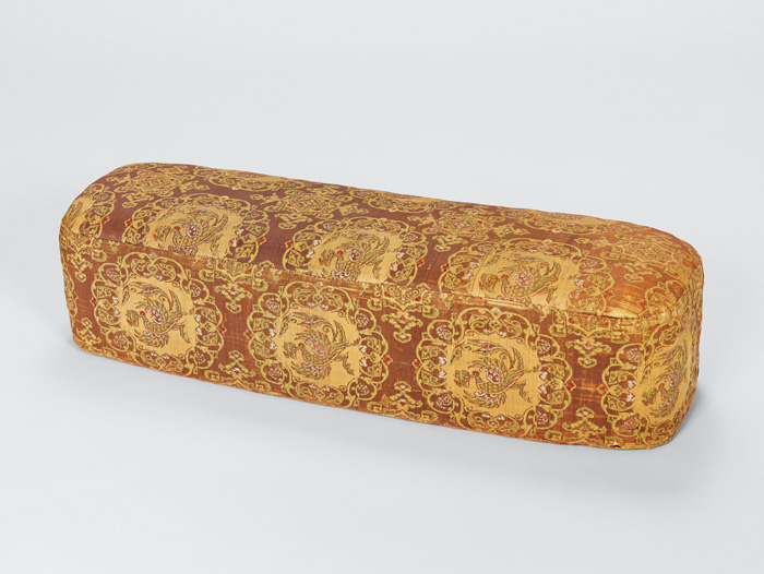 『国家珍宝帳』記載の豪華な肘おき。マコモとみられる植物素材を束ねて畳表で巻き、真綿を詰めて麻布で包んだ後、表に錦を張っている。体を預けるのに適した固さを考慮した構造と言えるだろう。錦には葡萄唐草の円文で取り囲まれた鳳凰が織り表わされ、胸を張り両の翼を広げた姿は実に堂々としている。西アジア由来の動物円文を唐代美術の様式によって昇華させた見事な文様構成であり、聖武天皇の持ち物に相応しく格調高い。