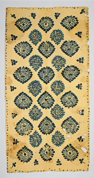 花氈とは文様を表した羊毛フェルト製の敷物のこと。中央アジアの遊牧民に由来する技法で、唐代には特に華やかな作品が作られた。本品は白地に藍色の花文様を全体に配した大型の花氈で、角張った葉を持つ濃い色調の花と、丸みのある葉を持つ薄い色調の花の繰り返しがリズミカルである。織文様のように規格された技法ではなし得ない、花氈独特のゆらぎある表現。それが大らかでありつつ可憐な印象を与え、本品の魅力となっている。