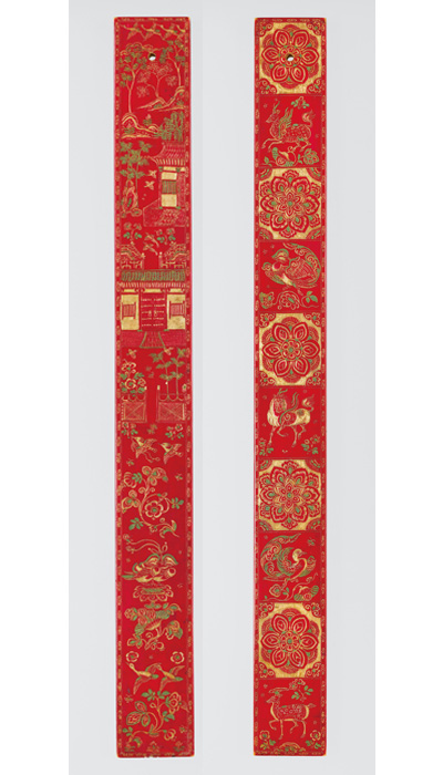 装飾性の高い象牙製のものさし。白い象牙の表面をいったん紅色に染めてから彫り、染まっていない白色を見せることによって文様を表している。さらにところどころ緑色を加えて美しく飾る。当時の1尺ほどの長さだが、実用というより宮廷の儀礼のために用意されたものと考えられている。類例は正倉院以外にも数点残るが極めて少ない。本品では、表面と裏面半分に瑞祥的意味合いのある架空の動物や鳥と唐花文、裏面のもう半分には庭園のある堂閣を含む景観が表されている。