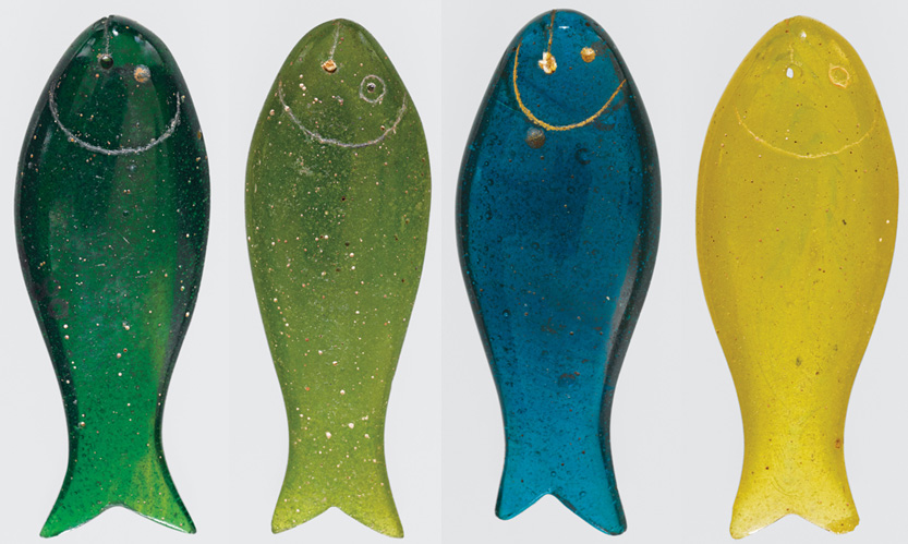 なんとも愛らしいガラス製の魚たち。これらは本来紐を通して腰から下げる飾りであった。古代中国において魚は吉祥の象徴とされ、宮廷においては身分の証明として魚形の割り符を腰に付ける制度が定められていた。本品は割り符という機能をはなれて装飾品として作られたもので、所持した人の高貴さを示すものであったろう。アルカリ石灰ガラスと考えられる碧瑠璃魚形以外は鉛ガラスであり、ガラスの塊を削って成形されている。
