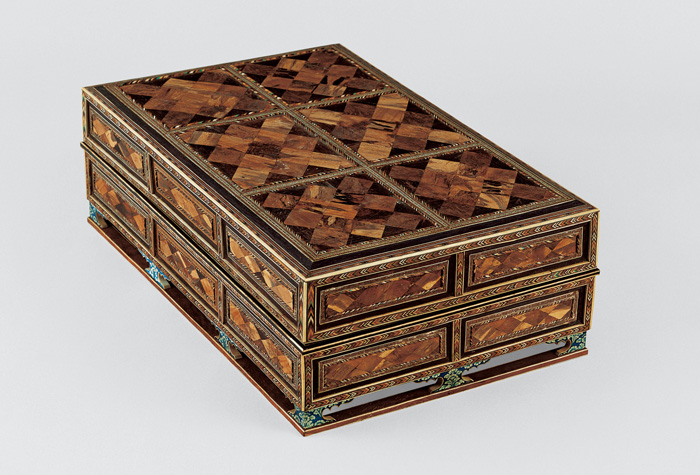 床脚の付いた長方形、逆印籠蓋造の箱。表面には菱形や三角形に切った沈香の薄板を貼って甃文を表し、象牙の界線やコクタンの薄板、矢羽根文の木画などで区画する。床脚の束は紺色に染めた象牙の表面に草花文を彫り表した撥鏤技法で装飾する。箱内にはビャクダンの薄板を貼り、花文を織り出した錦の内張(嚫)を入れる。舶来の高級な素材をぜいたくに用い、華麗に装飾した箱であることから、貴重な品物を納めてほとけに捧げられたと考えられる。