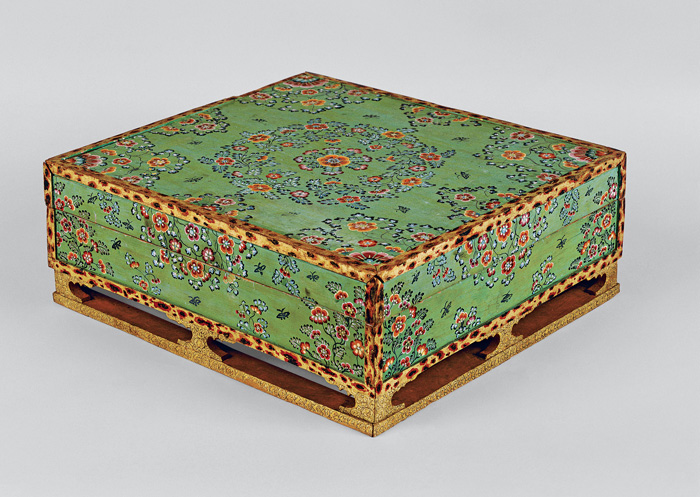 品物を納めてほとけに捧げられたと考えられる華やかな装飾の箱。緑色の地に赤色や橙色などの極彩色で花文を描く。周縁には金箔を貼って赤色と黒色で斑を描き、玳瑁(ウミガメの甲羅)を貼ったかのような艶を表現する。箱を支える床脚には金箔地に墨で唐草文を描いて透彫の金具のように見せる。大陸から輸入される希少な素材や製作工程の複雑な部品を絵で模すことで、効率よく美しい箱を製作しようとする工夫がみられる。