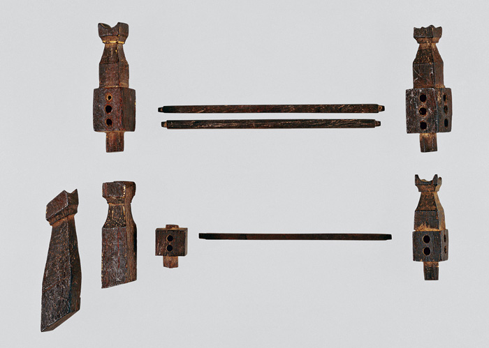 小建築の部材が伝わったもの。宝庫に伝わる総数582片のうち、部位を特定できるものは、組物、軒廻り、高欄など495片を数える。同じ部材でも寸法の異なるものが混在し、階ごとに規格を違えた多層建築であったとも考えられている。当初の形を復元するには至っていないが、一部に截金や飾金具の痕跡もあり、きらびやかな姿が偲ばれる。最近の研究で、芯材の表面にシタンの薄板を貼り、あるいはシタンの小材を複数寄せて形成した部材が含まれるなど、貴重なシタンを節約した工夫の痕が確認された。