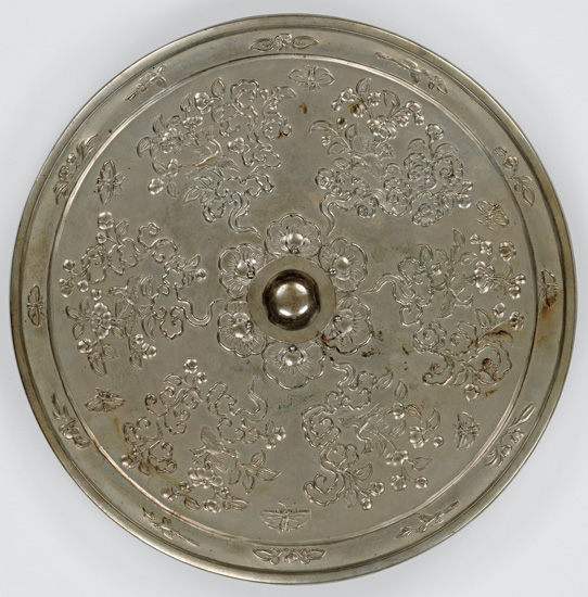 白銅(錫を多く含む青銅)鋳造の大型の円形鏡。『国家珍宝帳』(聖武天皇の四十九日に光明皇后が大仏に献納した品々の目録)に記載された聖武天皇ゆかりの鏡20面のうちのひとつ。鏡背には唐花や瑞雲、飛鳥といった文様が浮き彫り風に鋳出されており、その繊細な表現は、当時一級の品としての格調の高さを示している。成分分析によって、中国・唐代の銅鏡と金属の組成が近いことがわかり、唐からの舶載品とみられている。