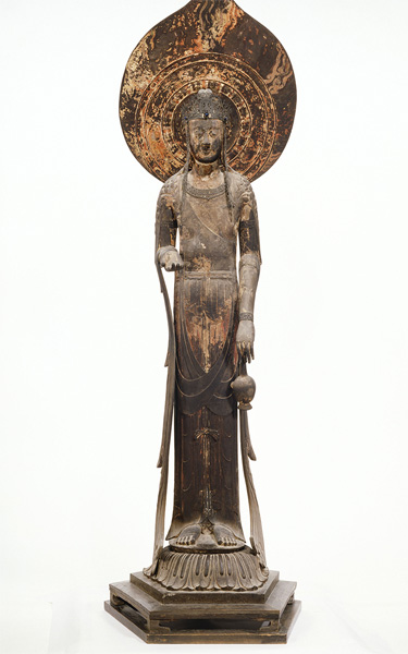飛鳥時代仏教彫刻を代表する傑作のひとつ。クスノキの一木造(いちぼくづくり)で、華麗な文様が施された光背(こうはい)や装身具、台座も制作当初のものです。ほっそりして伸びやかなすがたが特徴で、面長で彫りの浅い愛らしい顔や、絵画的な衣のひだ、細身ながら柔らかみのある肉身の表現など、他の仏像に見られない個性的な造形が魅力です。