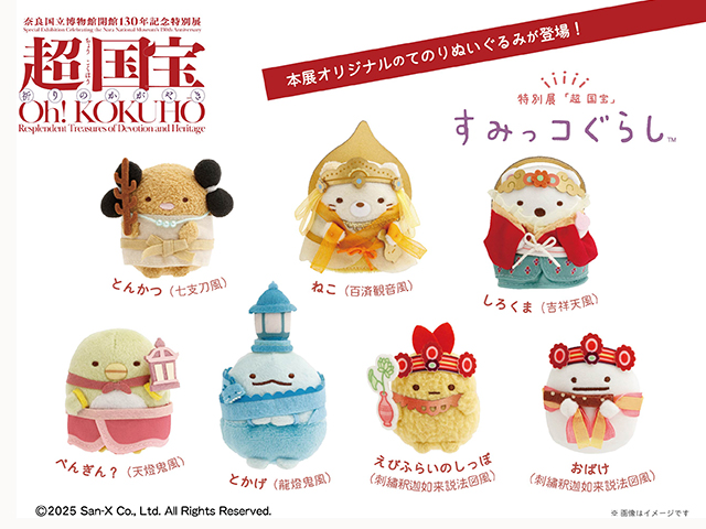 本展の公式応援キャラクターの「すみっコ」たちがてのりぬいぐるみになりました。奈良・法隆寺の国宝「観音菩薩立像 百済観音」をはじめ、薬師寺の国宝「吉祥天像」や石上神宮の国宝「七支刀」など、仏像に扮したり、名刀を持っていたり、様々な国宝と楽しく遊ぶ、本展オリジナルデザインのてのりぬいぐるみ(全7種)をお得にコンプリートできる観覧券とのセット券です!