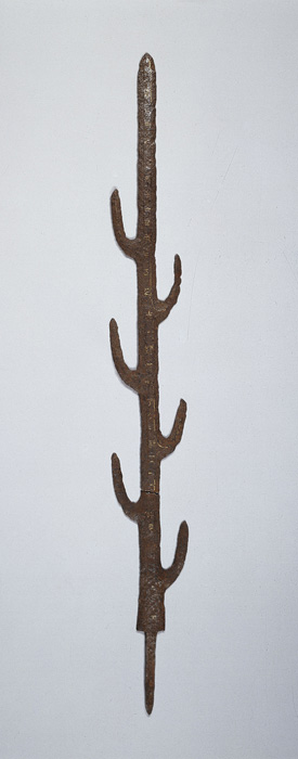 左右にそれぞれ3本の枝刃を交互に作り出す、唯一無二の形状の剣。両面に計61文字の漢字が金で象嵌(ぞうがん)されています。冒頭の2文字は中国の年号とみられ(西暦369年説が有力)、その年に朝鮮半島・百済(くだら)の王が倭王(わおう)のために作ったことが記されます。古代日本をめぐる国際関係を垣間見ることのできる超一級の名品です。