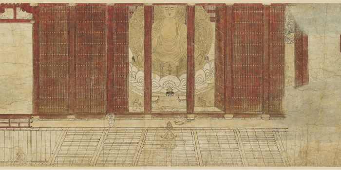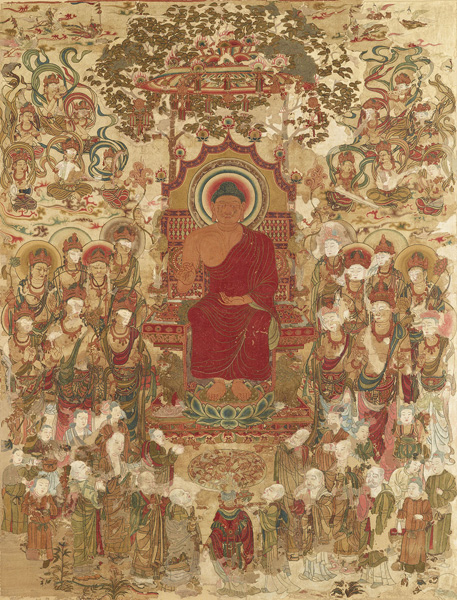 堂々たる姿の如来像を中心に多数の尊像を表わした古代刺繡工芸の最高傑作。右肩を肌脱いだ如来が豪華な背もたれを伴う宝座に座る姿は玄奘三蔵がインドからもたらした図像です。唐の宮廷工房で製作されたと考えられる一方、法隆寺金堂壁画ととても近い表現が見られ、わが国の飛鳥時代に作られたという説もあります。