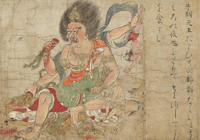 疫病(えきびょう)や災いを引きおこす鬼とたたかう神々を描いた平安絵巻の傑作。鬼を酢に漬けて食い疫病を退散させる「天刑星」、朝に 3,000、夕に 300 の鬼を食らう大食漢の「神虫(しんちゅう)」、仏法を邪魔する鬼を矢で射る「毘沙門天(びしゃもんてん)」等々。平和を守るヒーローたちの勇ましくもユーモラスな姿は、現代のわれわれにも訴えるものがあります。